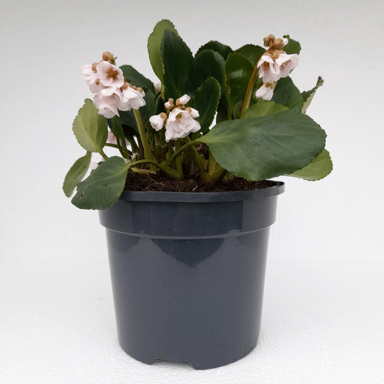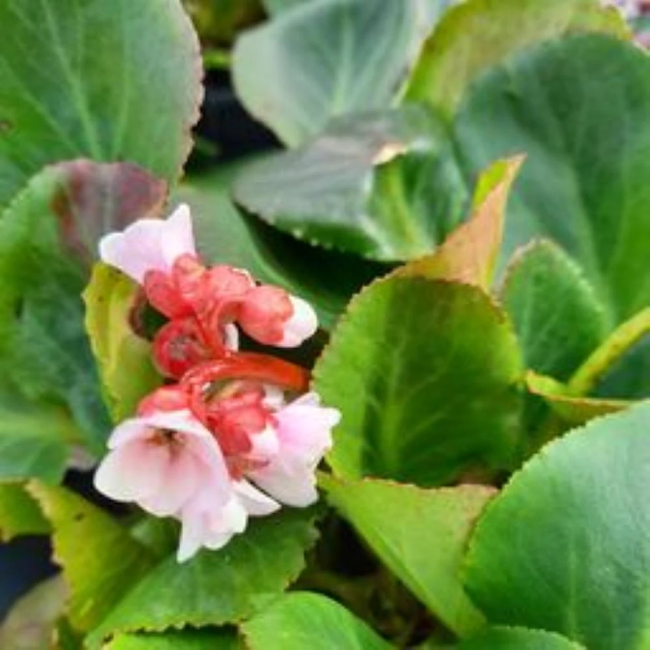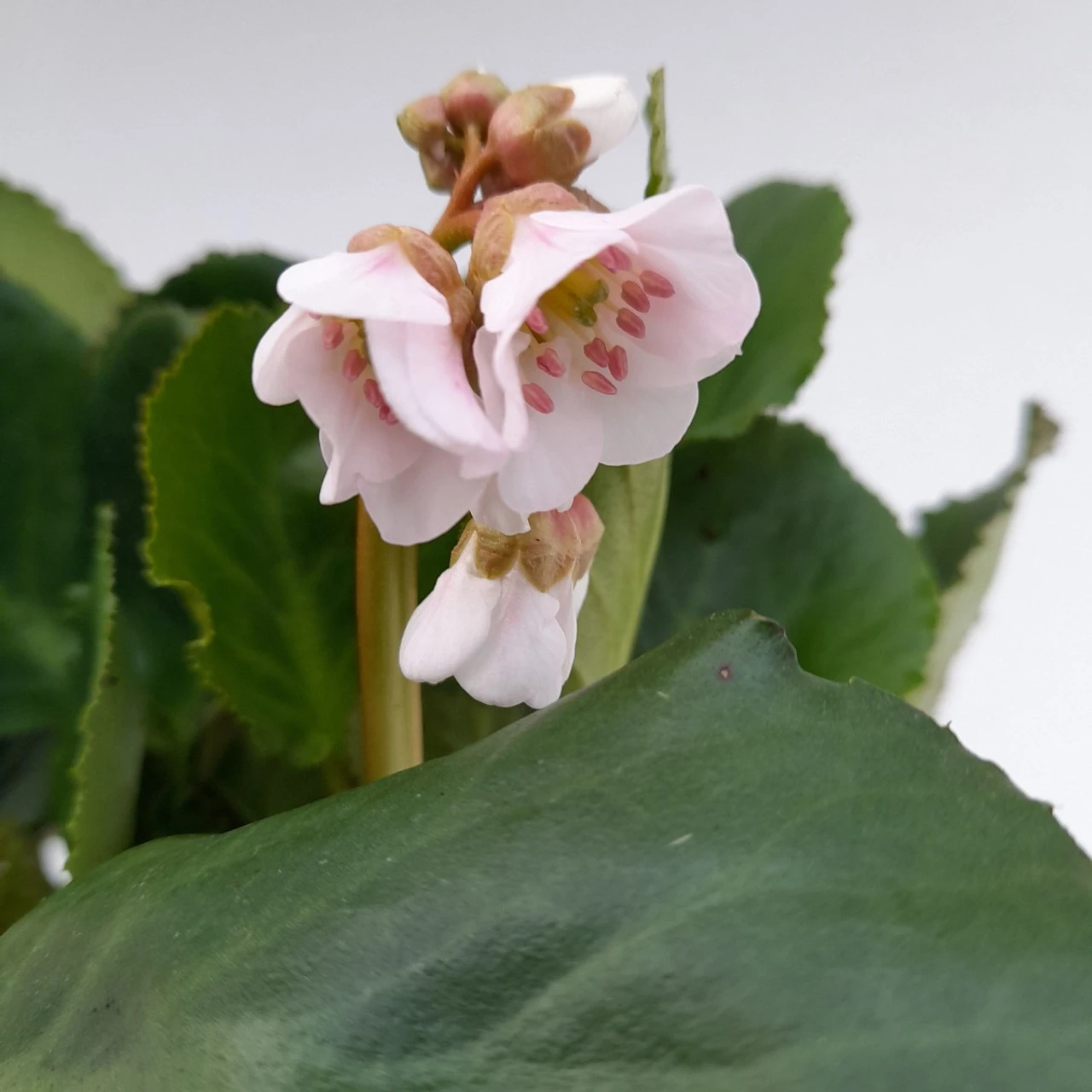 A lush and beautiful form that delights in ornamental clusters of pink and white flowers, almost like apple blossom in their effect. The flowers are held in tangy orange calyces and are brown at their heart. They appear from mid to late spring. The plant makes rosettes of rich glossy green leaves that are rather rounded in their effect.