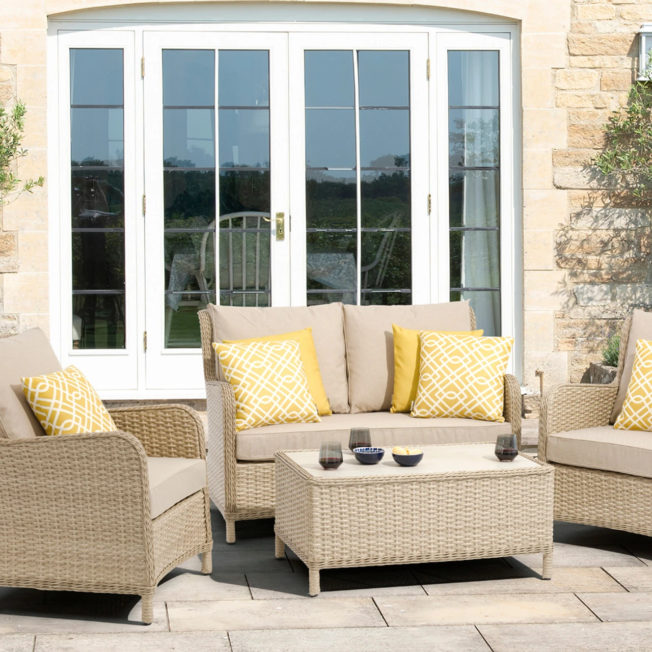 From its perfectly proportioned table to its tactile cushioning, this sofa set offers maximum comfort and subtle sophistication. Sink back and relax in the rattan sofa and armchairs with sumptuous, soft-touch season-proof cushions. The versatile mix of seating creates an easy-going vibe – an ideal place for morning coffee and cosy get-togethers.