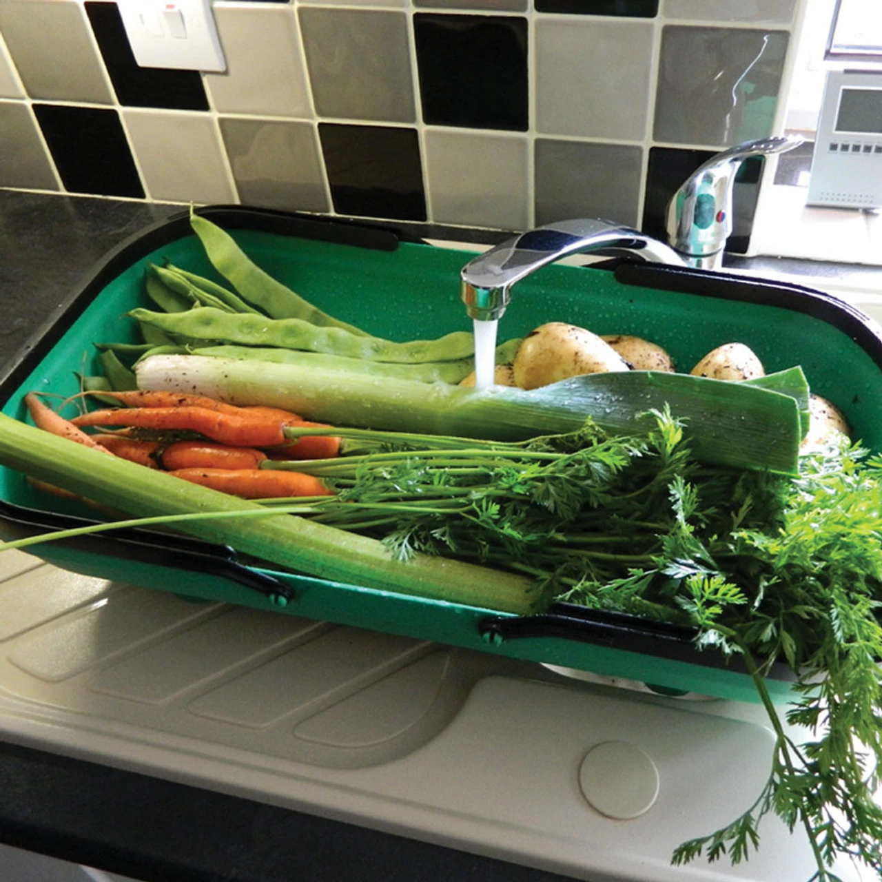 This colander trug is the perfect home companion, collect up all your vegetables from the garden in the generously sized trug, then simply place the trug on the drainer with the colander end over the sink and wash all your veg in the trug. Once washed simply drain the water out from the colander holes with no fuss, mess or spillage. Dimensions: L: 56cm x W: 31cm x H: 12cm