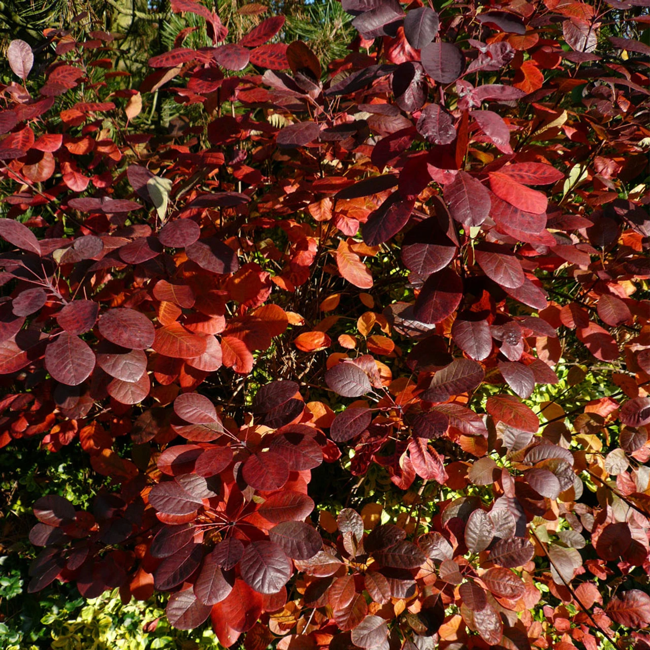 Cotinus coggygria ‘Royal Purple’ 3L Smoke bush A well known shrub with deep wine purple leaves which assume brilliant autumn colours before dropping. When the plant is mature it bears a few fluffy buff pink flower heads but it is chiefly grown for its foliage effect. It can be pruned in the spring if the plant becomes to large. RHS AGM