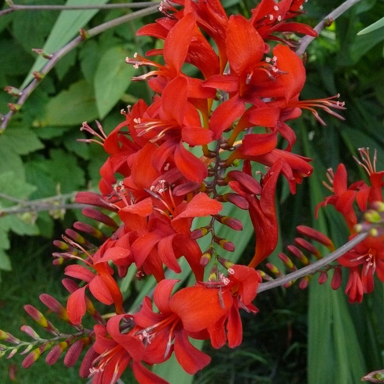 This famous variety bears deep red flowers in upright sprays above pleated leaves – it is strong and reliable and often the first Crocosmia to flower. RHS AGM