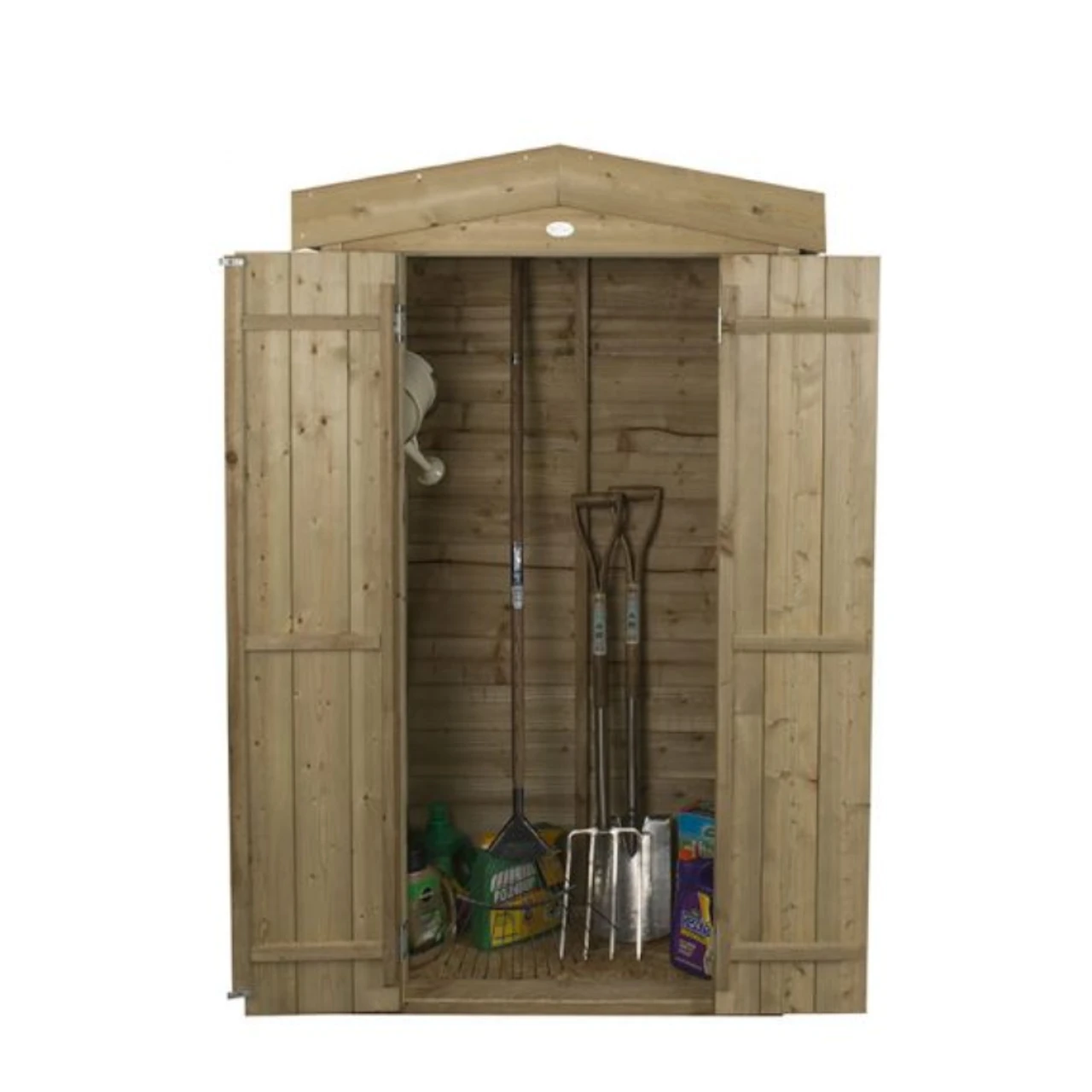 The felted Apex roof keeps the store weathertight and the floor is mounted on Pressure Treated bearers to keep it off the ground and dry. The double doors are fitted with a plate hasp and staple latch that can be securely fastened with an additional padlock.