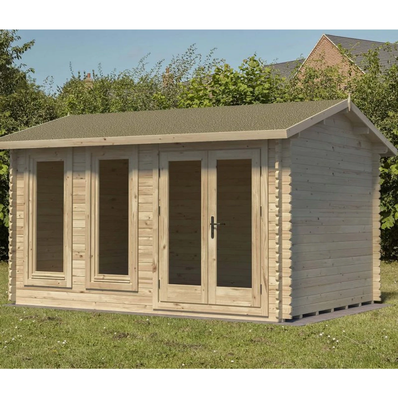 - 34mm thick interlocking log walls, 19mm floor and roof, double glazing, 24kg weight polyester felted roof with black sand felt underlay
