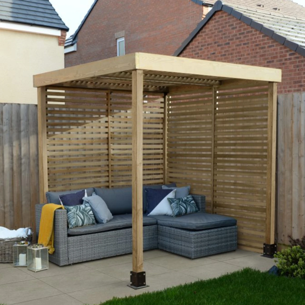This model comes with two slatted roof panels that give some shade from the sun and a pair of slatted side panels. These panels offer a degree of privacy and can be fixed together on any side depending on your preference.