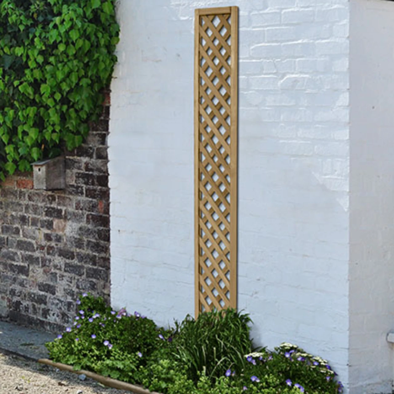 Designed primarily for mounting to an external wall or fence to create a garden feature that can support climbing plants, with battens that are spaced 43mm apart.