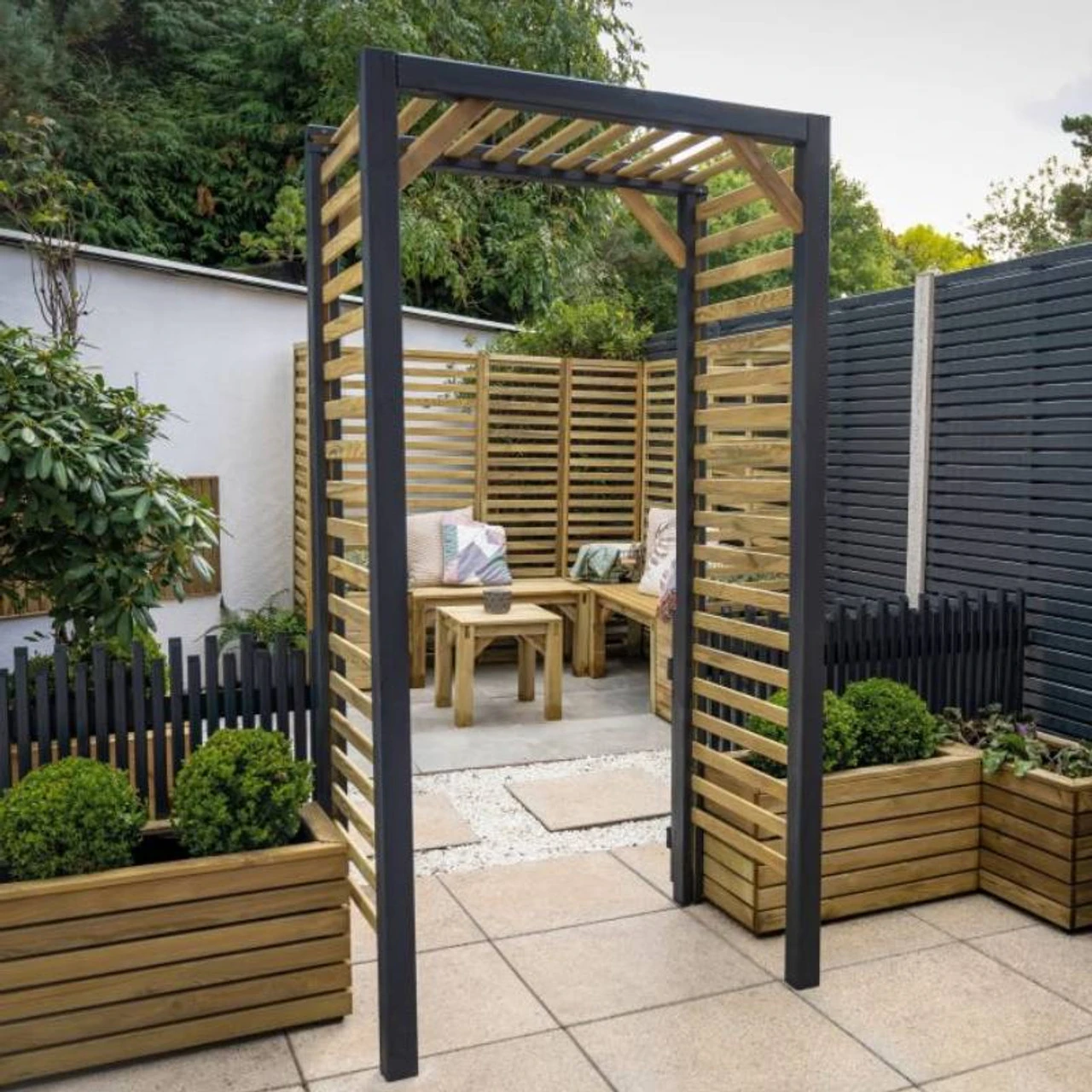 The contemporary Slatted Garden Arch from Forest Garden is ideal for your modern garden design.