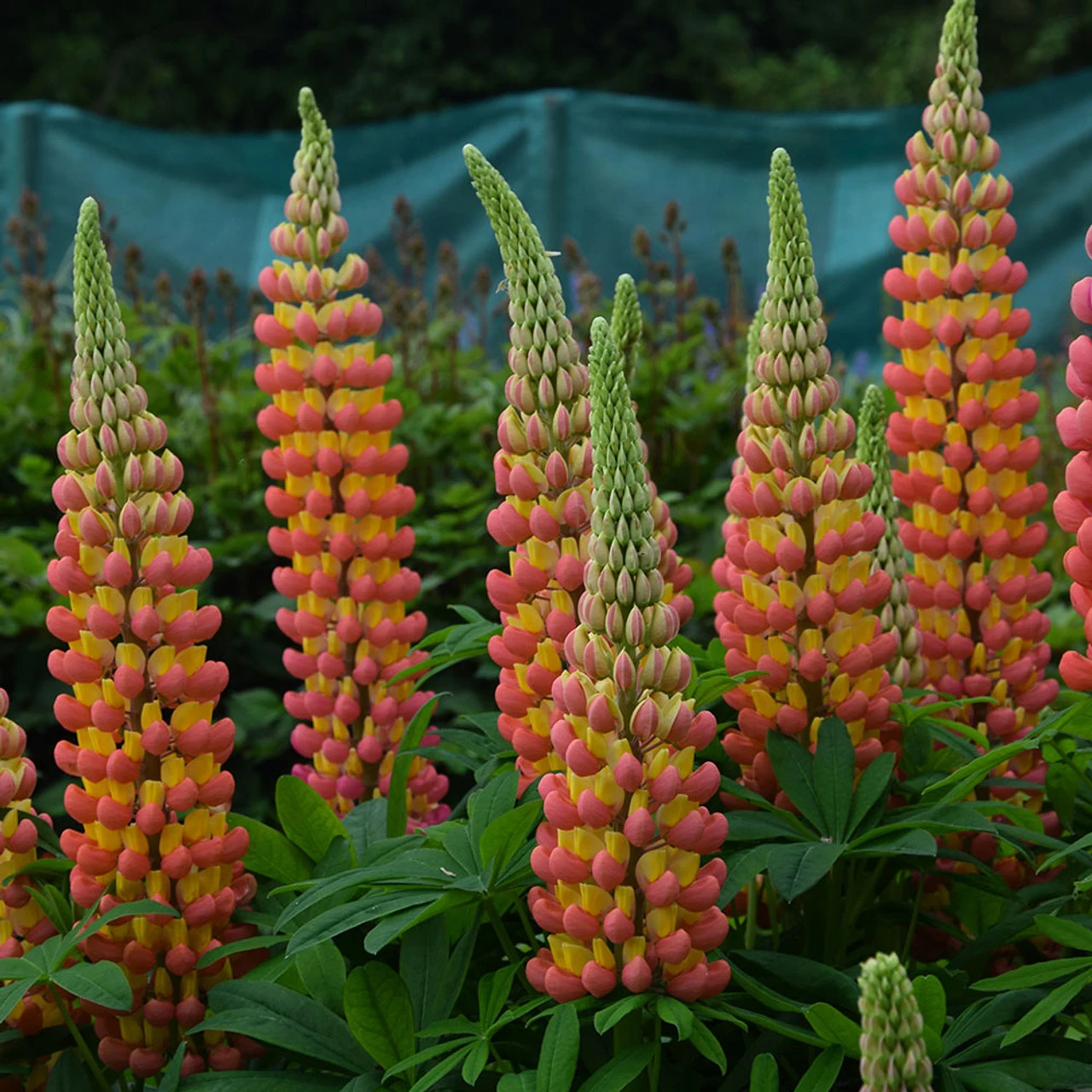 This is a showy bi-coloured flower. The broad tapering spires carry many large pea-flowers with pink-orange coloured lower petals and light yellow upper ones. The spires are carried above whorls of mid-green foliage.