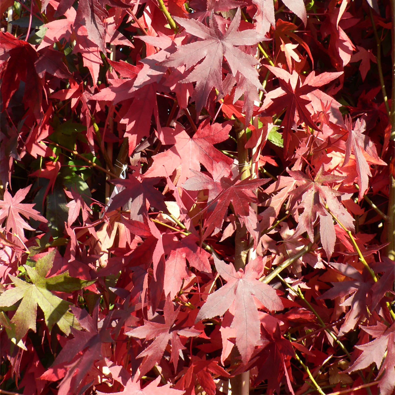 Liquidamber styraciflua ‘Worplesdon’ A beautiful tree with maple shaped leaves which colour up fantastically in the autumn in shades of red, orange and deep purple reds.This cultivar has reliable colour every year. An additional feature as the tree matures is the ridged corky bark. It forms a broadly columnar tree – slow growing but large in time and would make a beautiful feature where space allows. Large. RHS AGM Available for Click & Collect Only.
