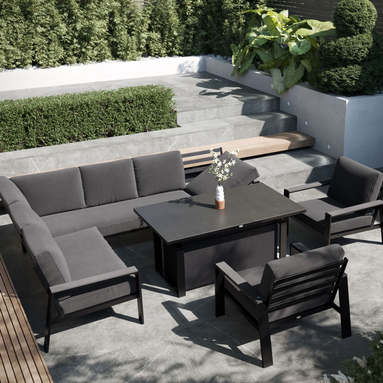 Relax on the soft, thick cushions of the spacious seating area of the Livorno corner modular set. The corner modular features a built-in height-adjustable chaise longue, transforming the seating into a sun lounger for versatility. This luxury set consists of a corner sofa with chaise longue, and a rectangular table. The supportive back bars give the Livorno chair a powerful character and with the large plump back cushions, the comfort is unforgettable. The thick Polywood armrests fit in nicely with the powder-coated frames creating an extra depth to Livorno’s overall style. The summer-proof cushions in the Livorno range provide optimal comfort. All cushion covers are zipped for easy cleaning and the fabric is designed to resist dampness and assist drying.