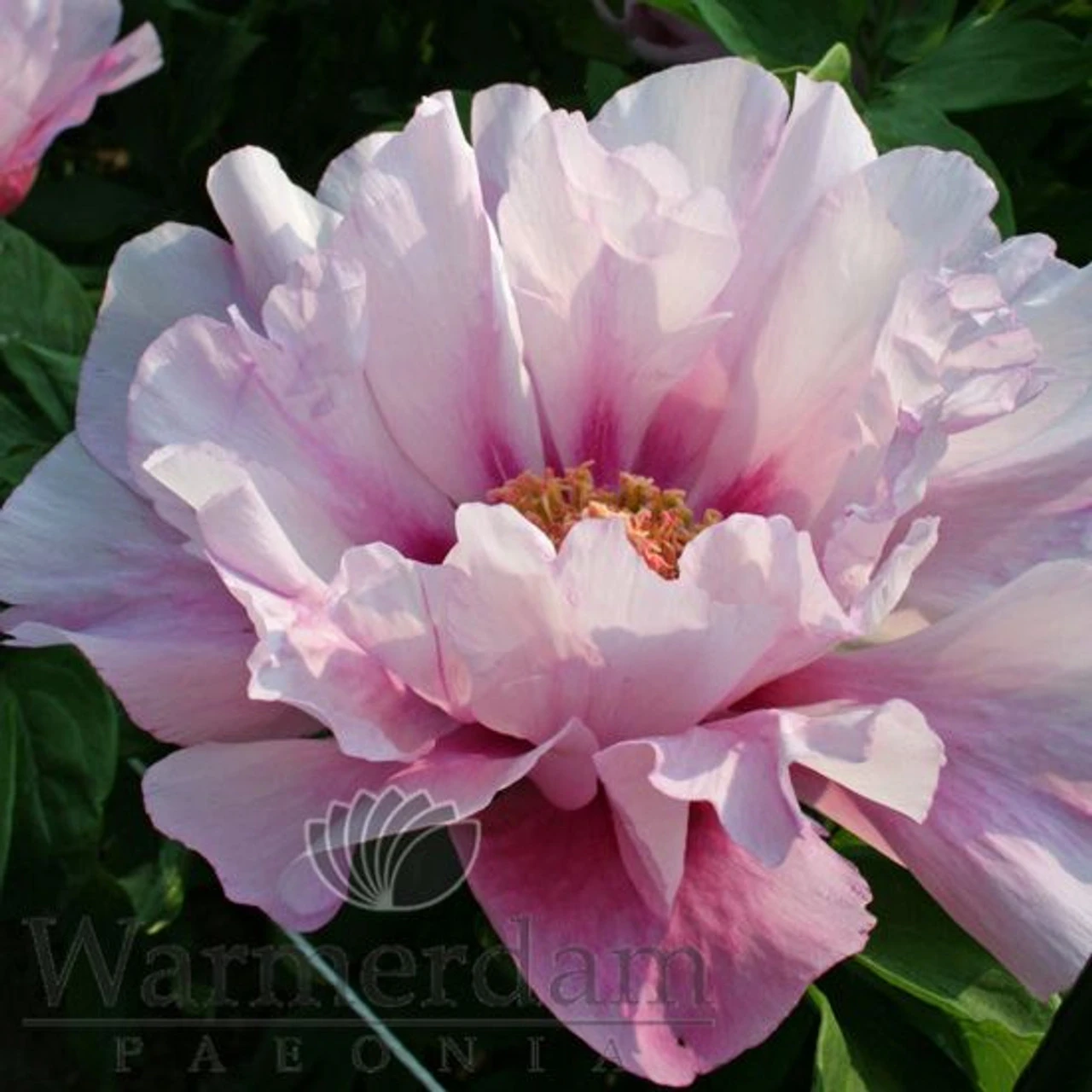 ‘First Arrival’ can be categorized as an ideal garden peony, being an intersectional hybrid peony. The very large showy semi-double flowers are of a distinct lavender pink color with darker flares at the base of the petals, the flowers fade to a lighter pink during the maturing process. With every year that this variety matures, the flowers will grow more double – a quite typical characteristic of semi-double peonies. The flowers are situated right on top of the dense foliage, creating a superb and compact bush. ‘First Arrival’ is still a favourit for most intersectional peony lovers.