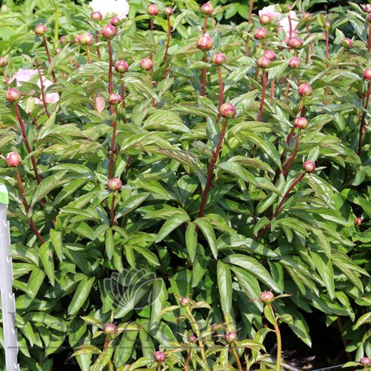 Full double, white cultivar with the occasional yellow stamen visible in the center of the large blooms. Flowering for this one usually starts off blush, and this can remain for a quite long time during dark and wet flowering seasons. ‘Gardenia’ is named after the genus to which the flower form is very comparable to. Very many side buds, providing an optional prolonged blooming season. Dark green and fairly coarse leaflets on thick red-tinted stems, combined with a relatively low plant habit make ‘Gardenia’ the stout peony she is!
