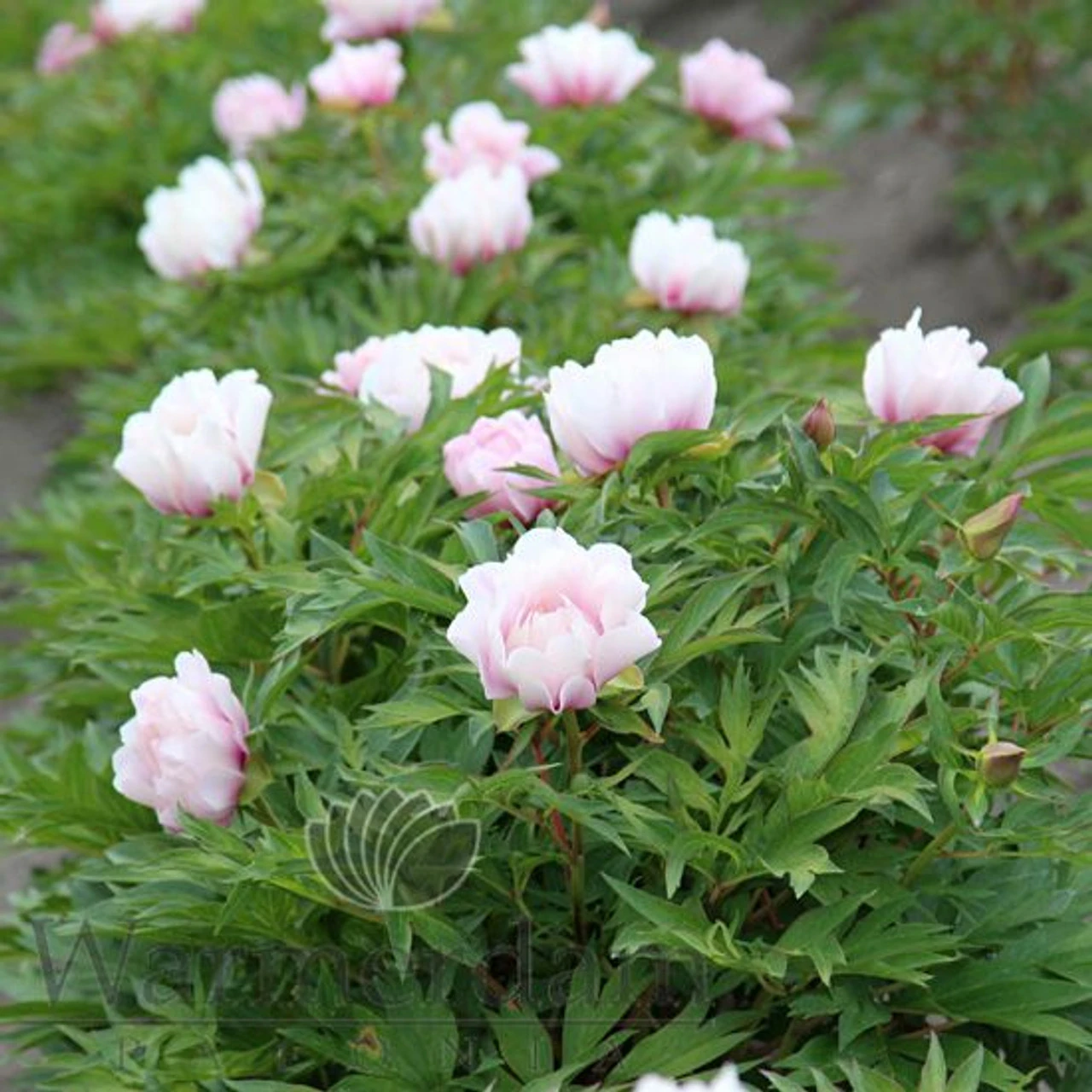 Lavender flowers that fade as they mature, with clear dark flames at the base of the petals. A first-class, and unique, intersectional hybrid. Very healthy looking, dark green and relatively finely cut foliage on really sturdy stems compose a neatly rounded bush with an ideal compact build for use in the landscape. These plants are exceptionally suitable for solitary planting. The breeder, the late Irene Tolomeo, has named this peony after her Basque mother. It goes without saying that only an extraordinary fine plant is good enough to name after one’s Mom. And that is exactly what ‘Ballarena de Saval’ is, with her fabulous plant habit and unique flowers.