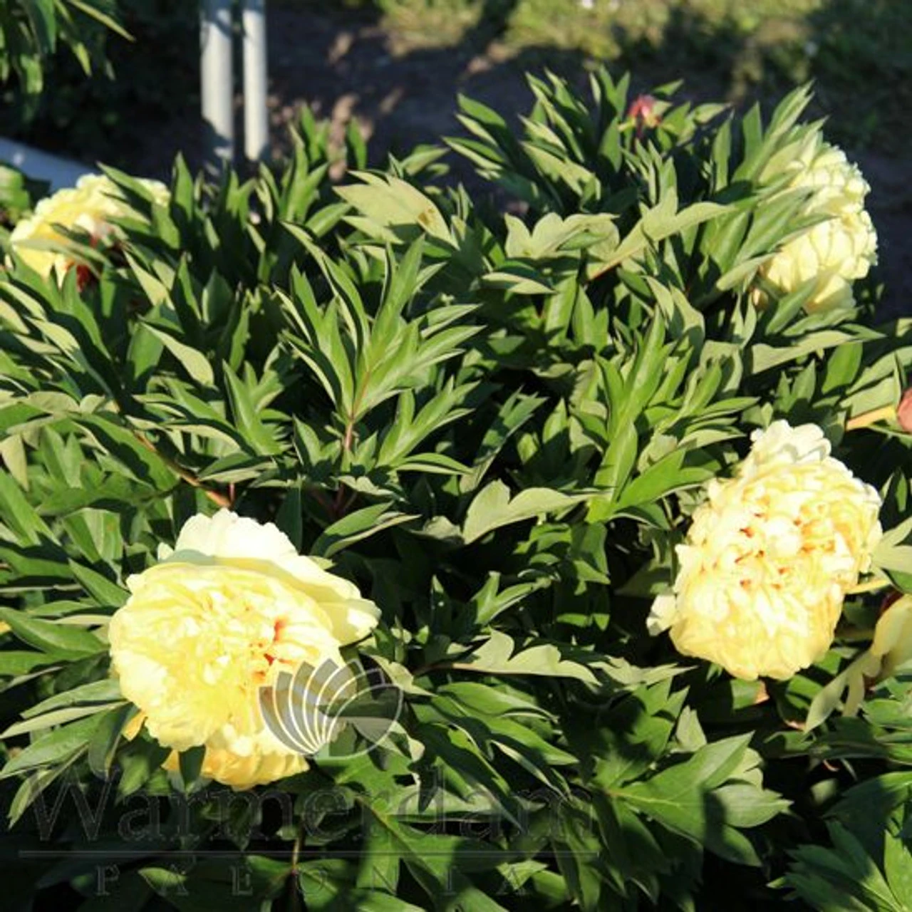 Typical plant habit and appearance for an intersectional hybrid peony (there are almost no exceptions for these excellent traits in this group!). The blooms of ‘Sonoma YeDo’ however, are extremely special and display the fullest blooms with the largest petal count of all intersectionals. The petals are fairly nicely rounded, but still slightly frilled though not as much as for ‘Sonoma Halo’. Also the yellow is a tint darker than that of “Halo”. Full double flowers of this cultivar will cover up the red of the flames on the base of the petals, but occasionally will peep through. Less full blooms will attract your attention to this stunning contrast. This intersectional wonder does not require any support, despite the large and heavy flowers. Really very choice, and a master showpiece in anyone’s garden.