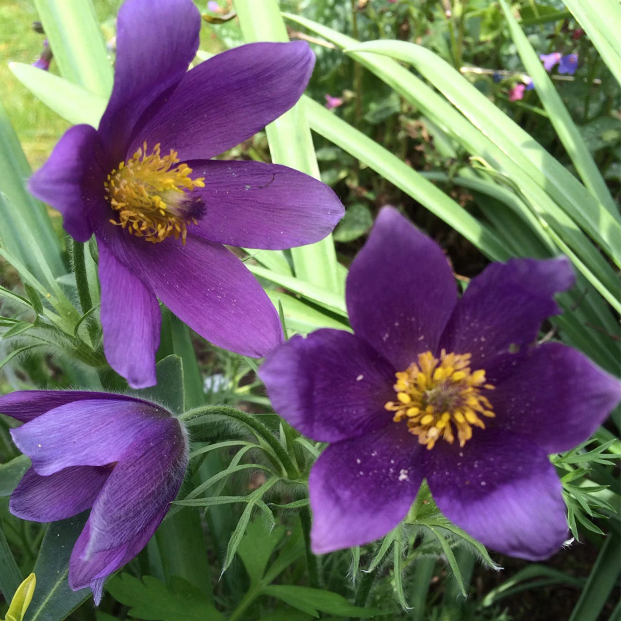 A stunningly beautiful rare British native usually grown on a rockery or at the front of a border with much divided silkily hairy leaves and goblet shaped flowers in a range of rich colours – violet blue through wine reds to white. It must have good drainage. RHS AGM
