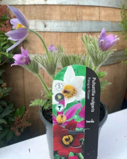 Pulsatilla vulgaris, the pasqueflower, is a species of flowering plant belonging to the buttercup family, found locally on calcareous grassland in Europe. It was considered part of the genus Anemone, to which it is closely related. Hardy and herbaceous perennial, the mid green foliage is fern like and finely cut. Hairy flower buds oped to cup shaped purple flowers in April and May. Best in a sunny position in well drained soil.