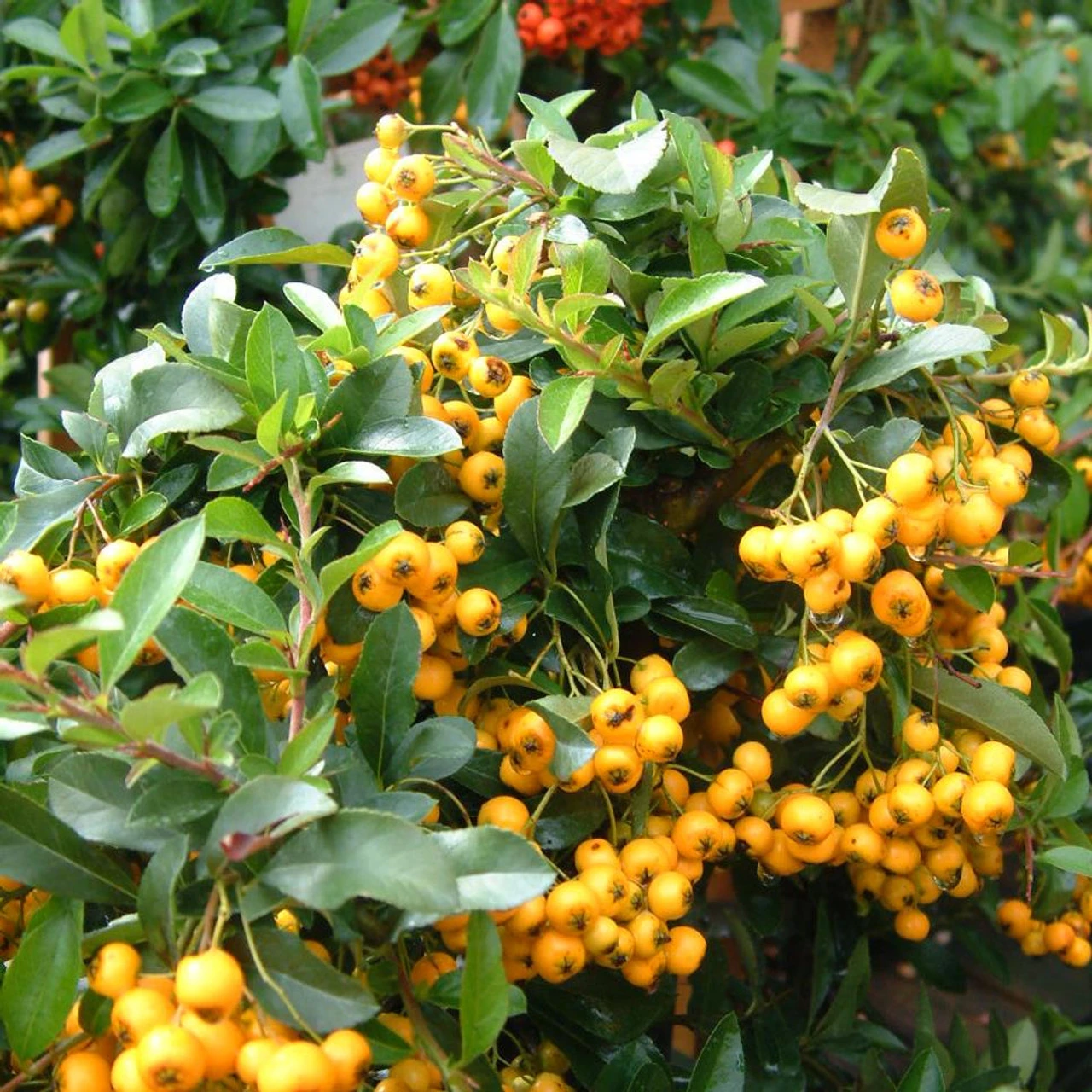 Pyracantha is a tough, hardy shrub, tolerant of a wide range of demanding conditions, including shaded and exposed positions. It grows into a dense thorny evergreen hedge, perfect for using to cover boundaries and training against walls. It bears a profusion of brightly coloured berries.