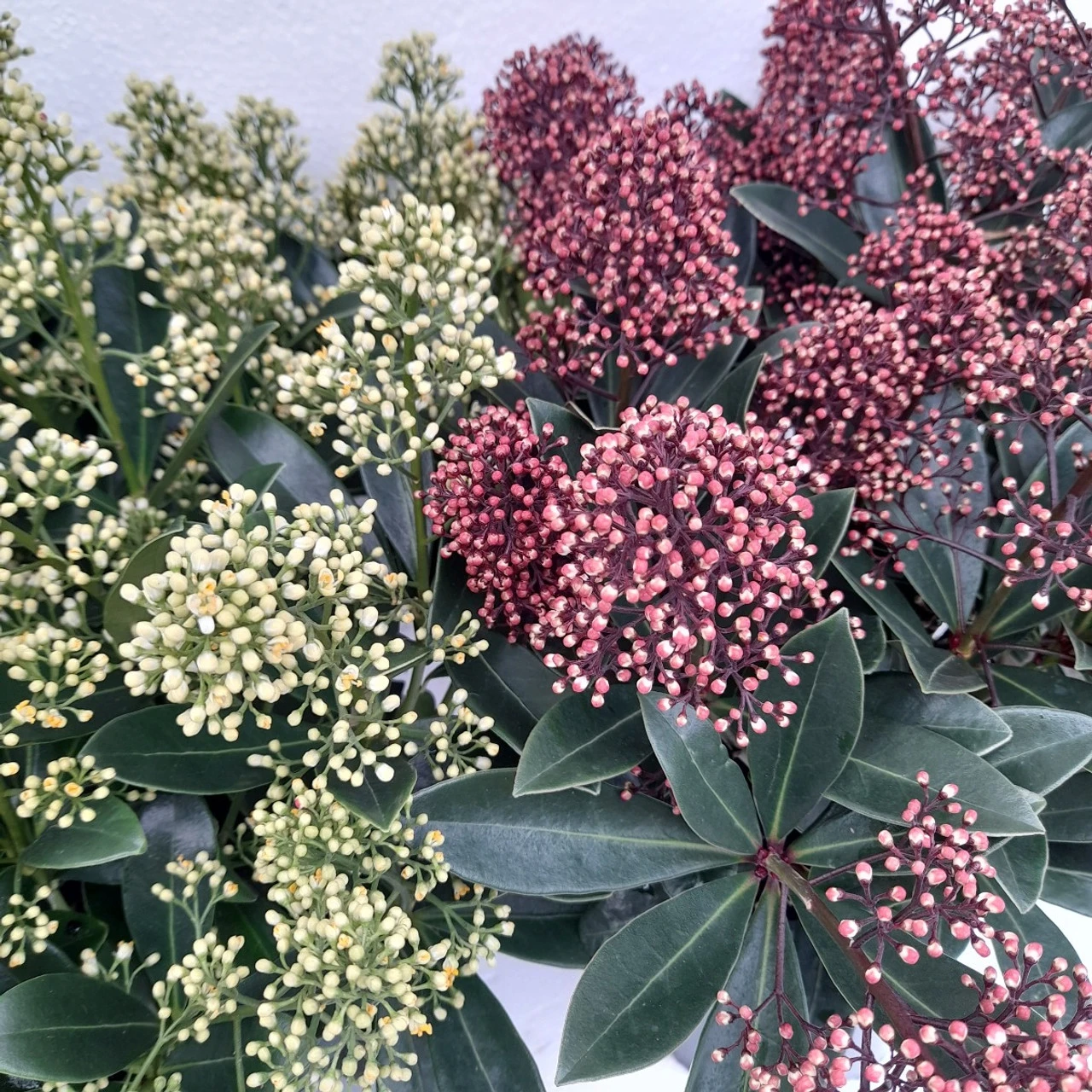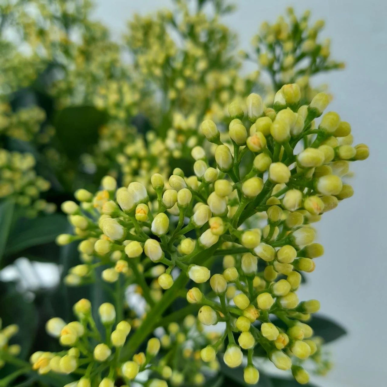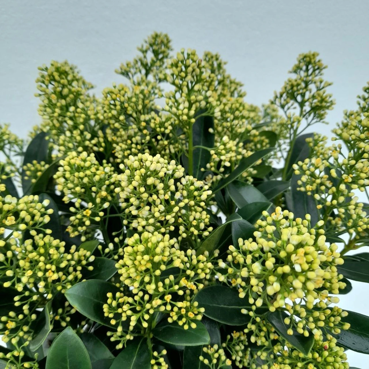 This makes a cool-effect upright small shrub with lustrous, rather sheeny dark green leaves that complement the creamy green flower buds. These are held in good-sized bell-shaped panicles and remain a feature all through winter. In spring they open to small starry white flowers that are long-lasting. A soothing green groundcover, perhaps beneath showy shrubs, or as a counterpoint to skimmia with red winter buds, or grown in a container to offset others that are very bright! Hint: Most skimmias are either male or female. Both have flowers but only the females have berries. It is necessary to grow both male and female forms to obtain fruits. Why not team up with Skimmia Rubella for a fantastic display.