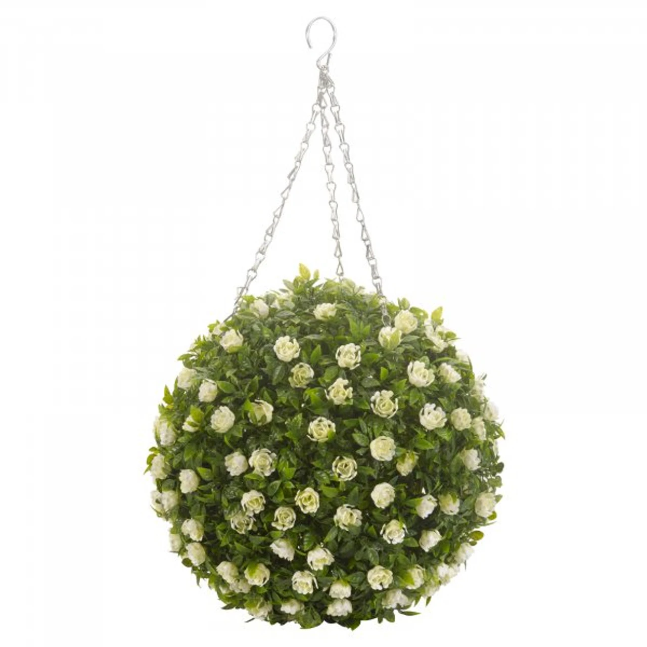 Artificial topiary ball decorated in white roses. An instant no-maintenance decorative solution for homes, gardens and more.