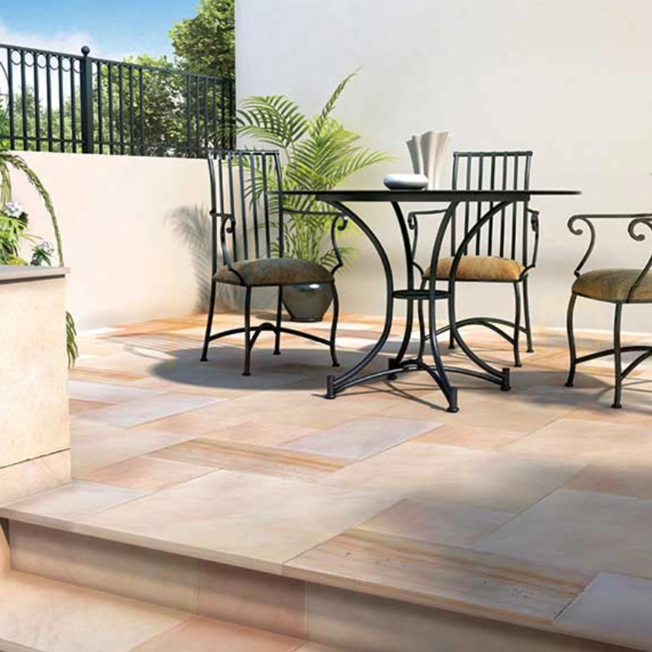 Sandstone is a popular choice for outdoor natural stone flooring due to its significant visual impact and functionality. The material performs well against winds, heavy rains, stains, frost, and heat, making it suitable for both indoor and outdoor applications, as well as domestic and commercial use.