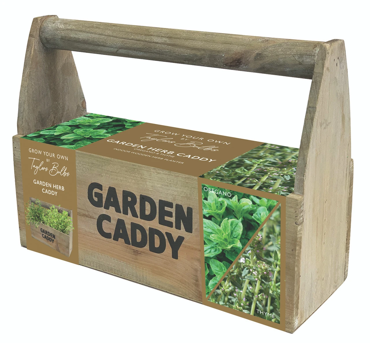 Wooden Garden caddy, peat free compost, culturals & seeds container Oregano & thyme.